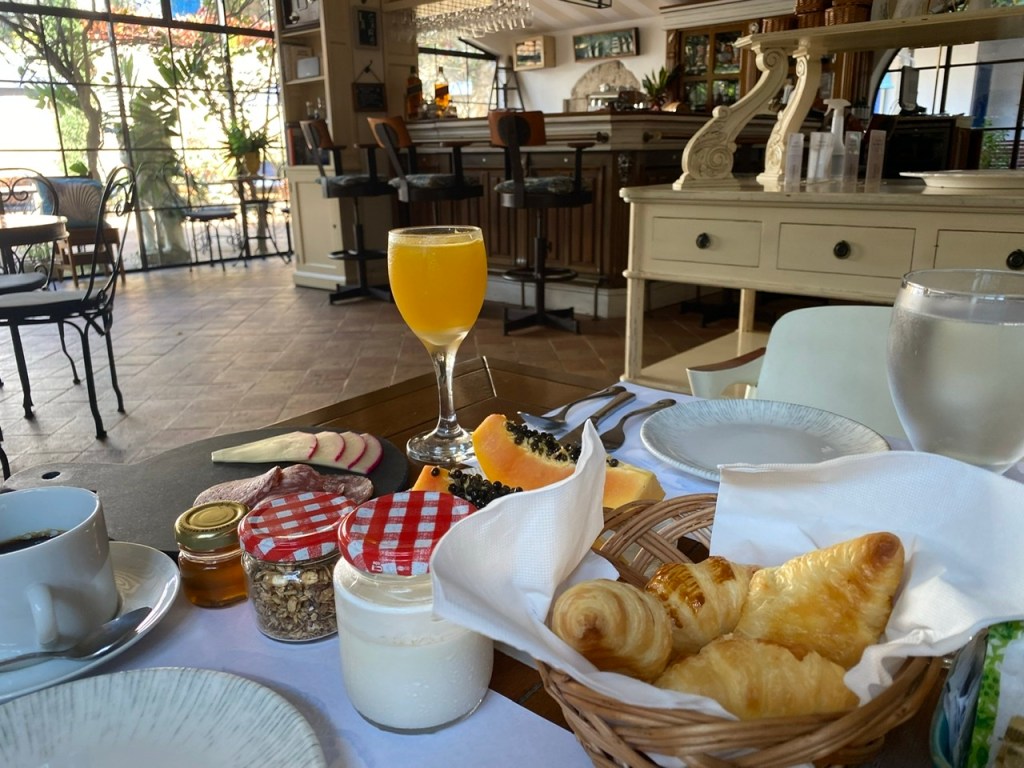 O café da manhã é sempre servido em cada uma das áreas da hospedagem, contendo pães, bolos, mel e geleias de produção local, além de delícias preparadas na hora.