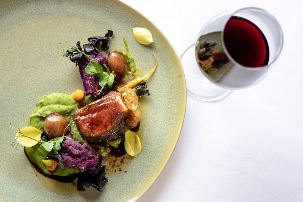 Como prato principal, um Vitelão com batata doce roxa, lapela de pimenta rosa, cebolinhas em vinho do Porto, cenouras baby sobre ervilha trufada e cogumelos trompetas da morte, acompanhado do vinho Taylor’s Late Bottled Vintage 2014. Para sobremesa Crème brûlée de caramelo sobre crumble de frutos secos, pipocas caramelizadas, groselhas e gelado de framboesa.