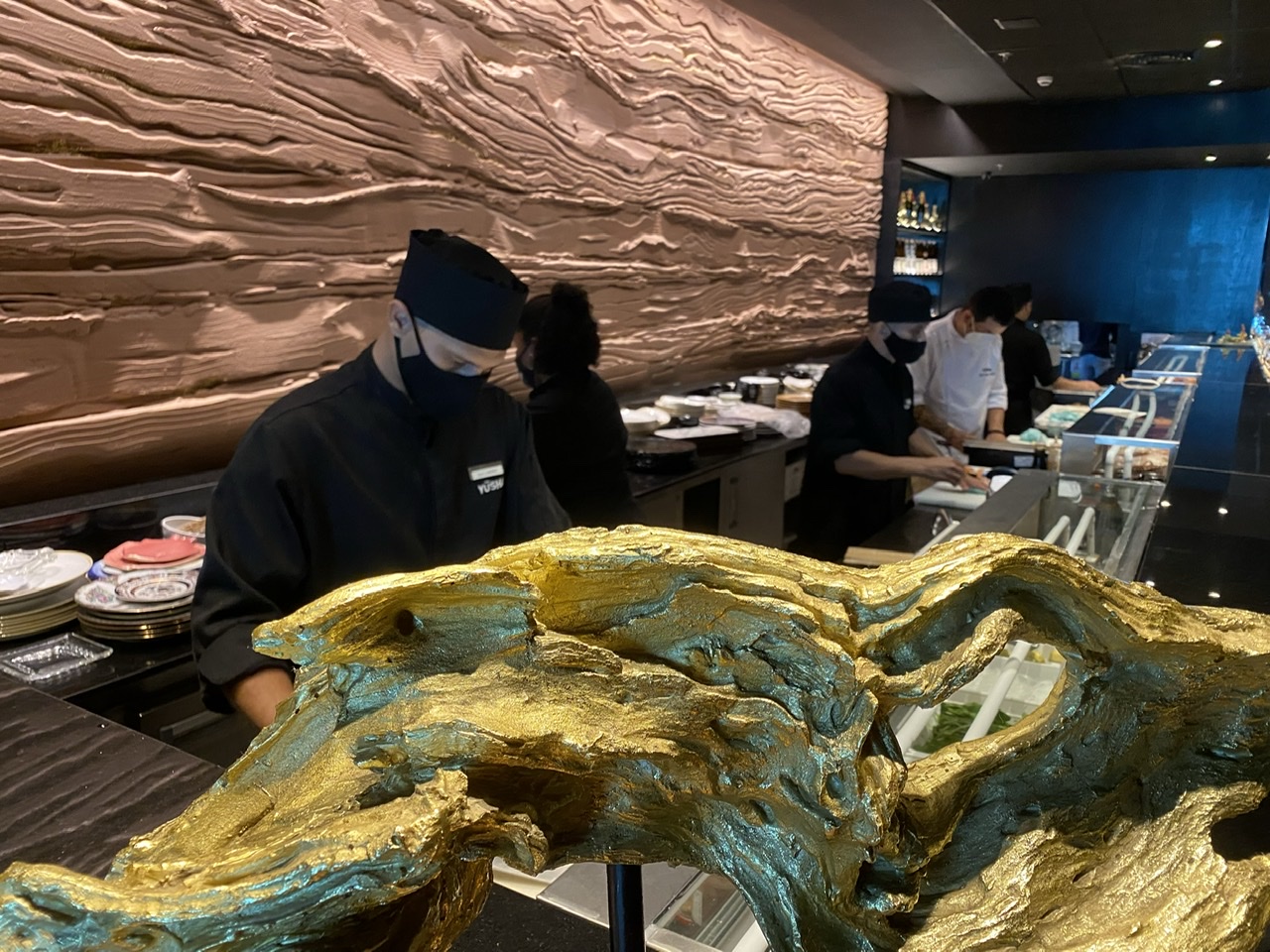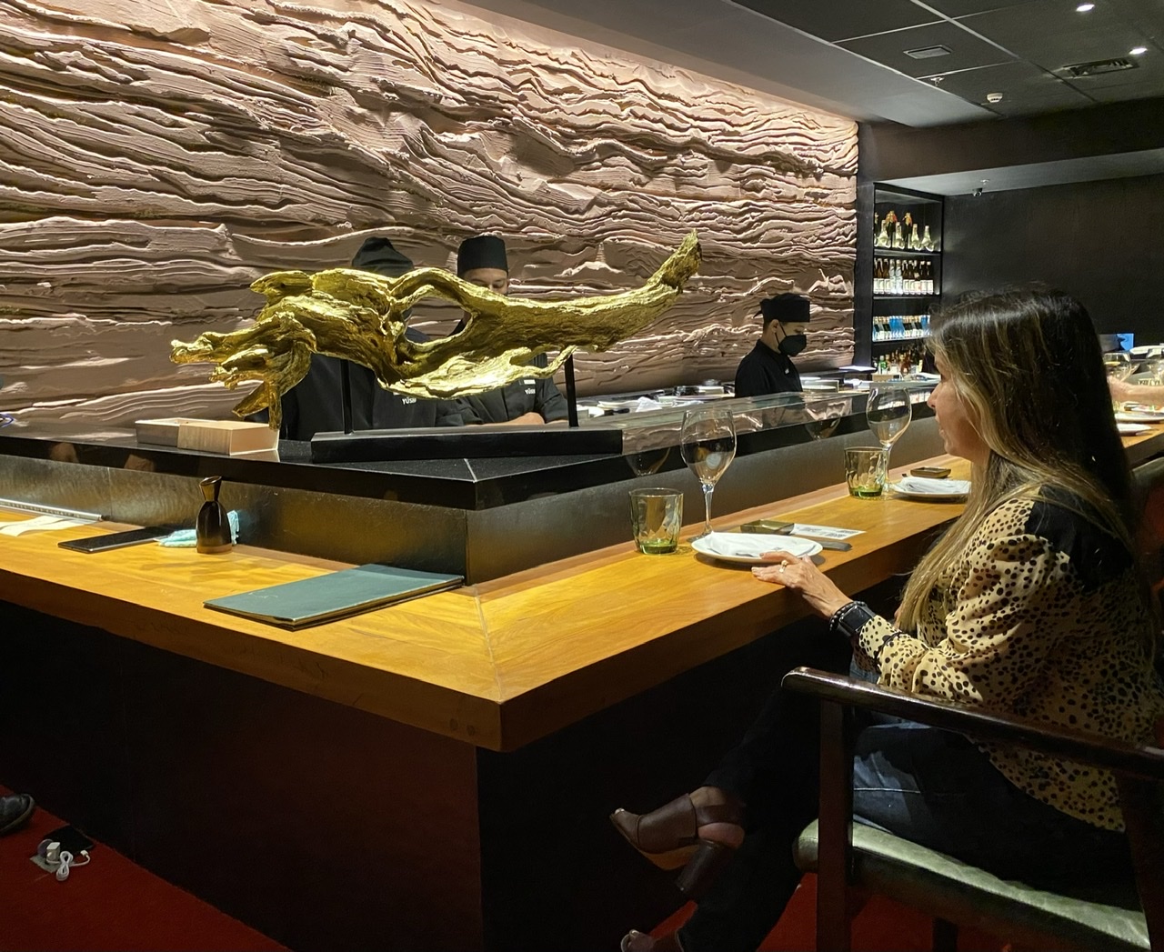 Chama a atenção dos visitantes logo à entrada um red carpet que convida para o sushi bar com poltronas e um amplo balcão onde é possível conferir o minucioso trabalho de elaboração de receitas japonesas exclusivas da casa. Os lounges privados completam o charme do salão.