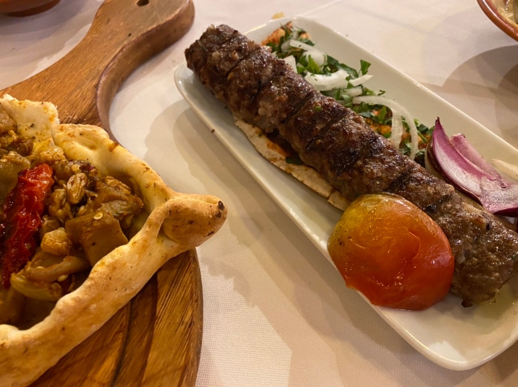 A Kafta no Espeto, prato entre os mais pedidos grelhados na brasa, é preparada no espeto com carne moída temperada com cebola e salsinha, o carro chefe da casa ainda acompanha homus, arroz com lentilha e cebola frita.