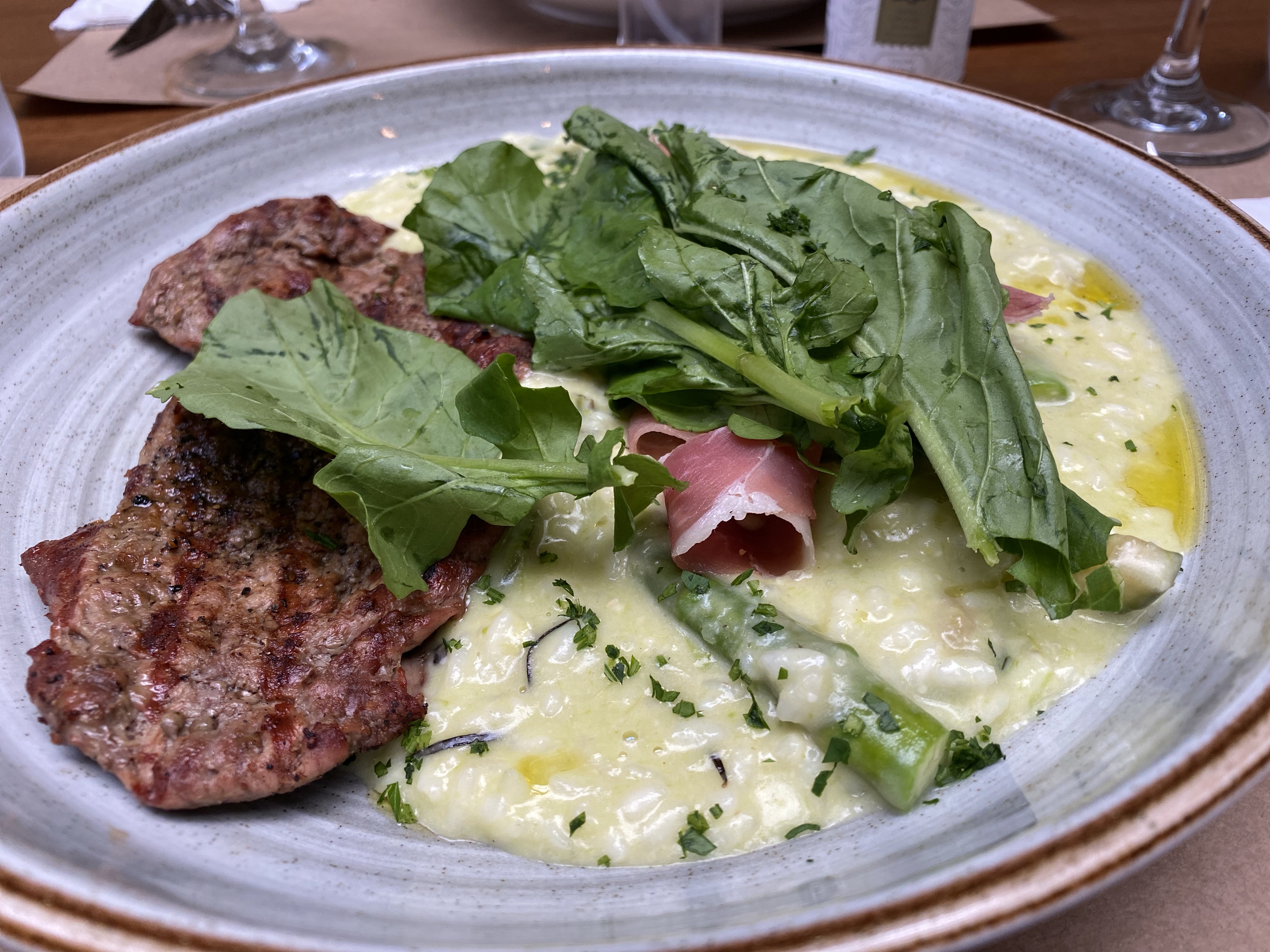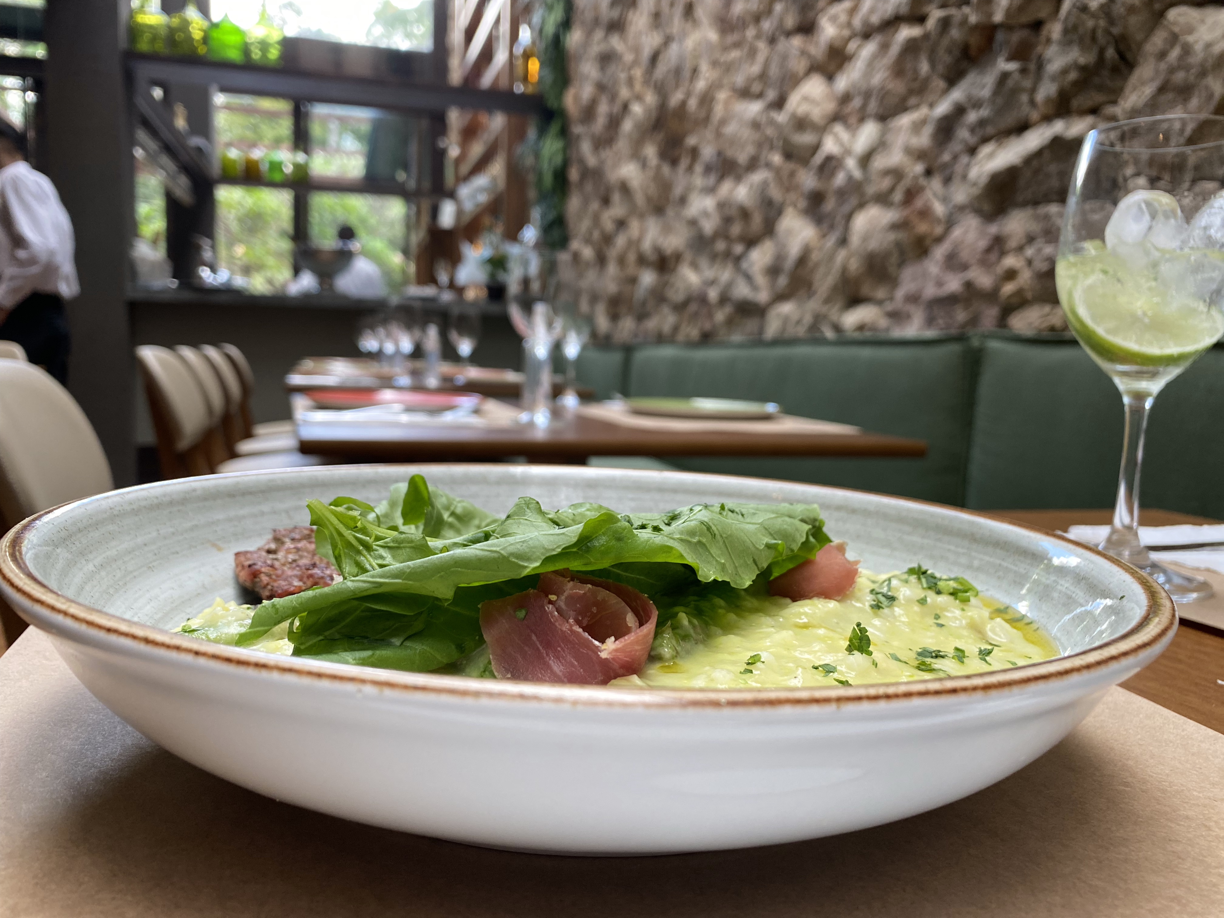 Um almoço no Foglia começa com saladinhas do chef, que você pode escolher num buffet muito seleto. Para os pratos principais, massas frescas e risotos são carro chefe. São destaque no menu: a Pasta al Forno na Panelinha – mezze maniche al ragù, creme e parmesão gratinado; o Fettuccine al Limone e Gamberetti – ao creme de limão, parmesão, camarões e polvere de prosciutto crudo;Mezze Maniche alla Vodka – massa ao pomodoro, pancetta, vodka e parmesão; e os risotos também fazem sucesso. Adorei o Risotto alle Verdure – arroz arbóreo, brie, parmesão, abobrinha, aspargos verdes, rúcula e fios de parma. Para acompanhar o fileto de mignon é uma boa dica.