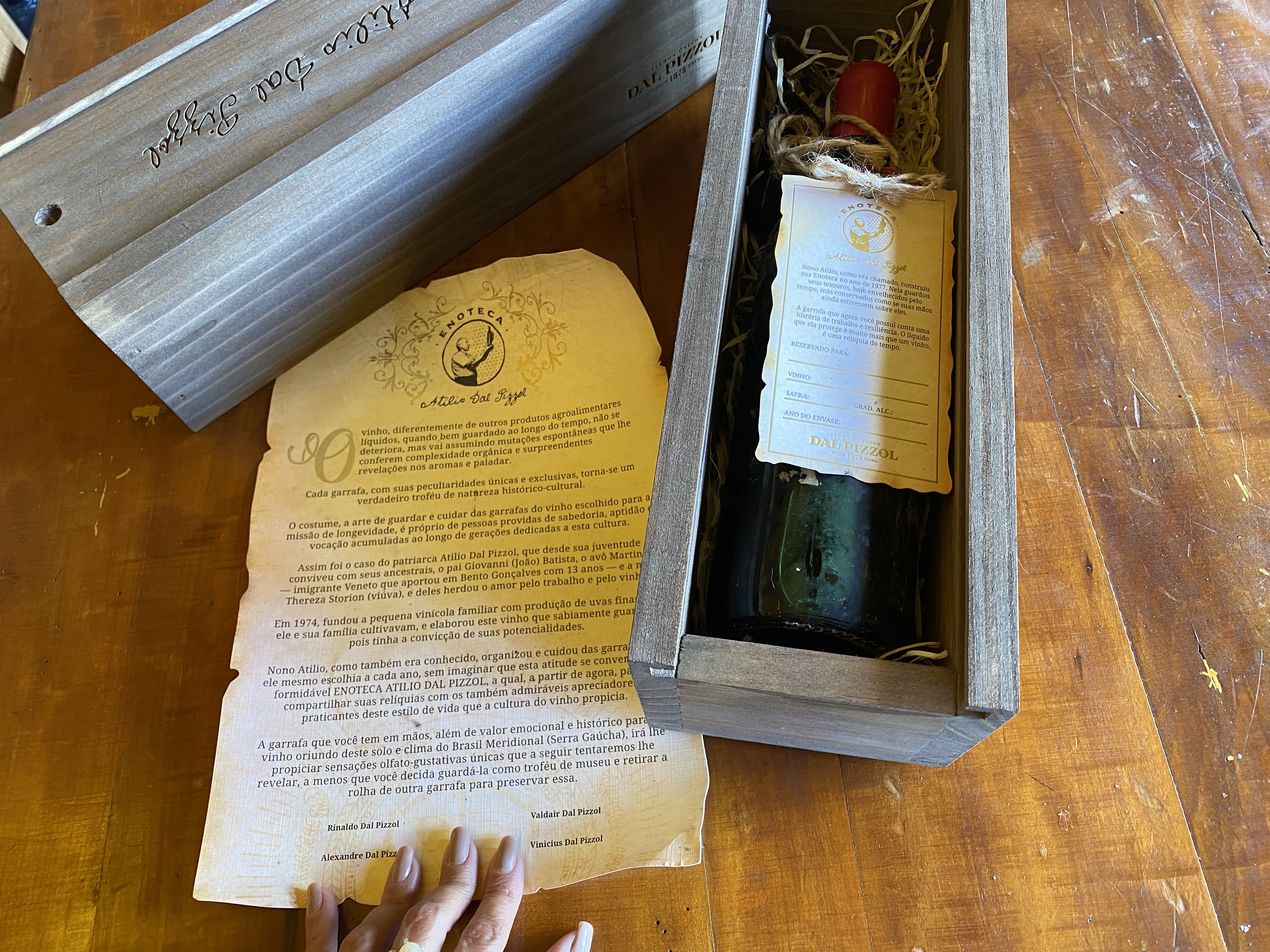 As garrafas recebem uma dedicatória com o nome do comprador, além de acompanhar um saca-rolhas e um manifesto com a história da enoteca assinado pelas gerações que levam o legado do Nono Atilio adiante.