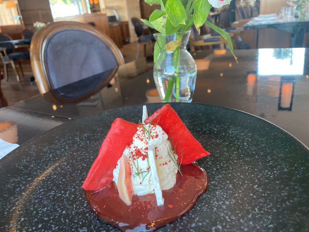 Desde as entradas, o menu surpreende e atrai a curiosidade dos comensais. Para começar chega a mesa um delicioso couvert com pães artesanais, grissinis e manteiga de mascarpone com raspas de limão. Para entrada, o chef sugere a Burrata Tricolore (queijo burrata, geleia caseira de tomate, farofinha de bacon e rúcula) e o arancini de cordeiro. Para harmonizar, uma taça de prosecco. “A burrata faz uma combinação clássica com o tomate. A diferença é que nossa geleia de tomate é caseira, um molho agridoce”, explica o chef.
