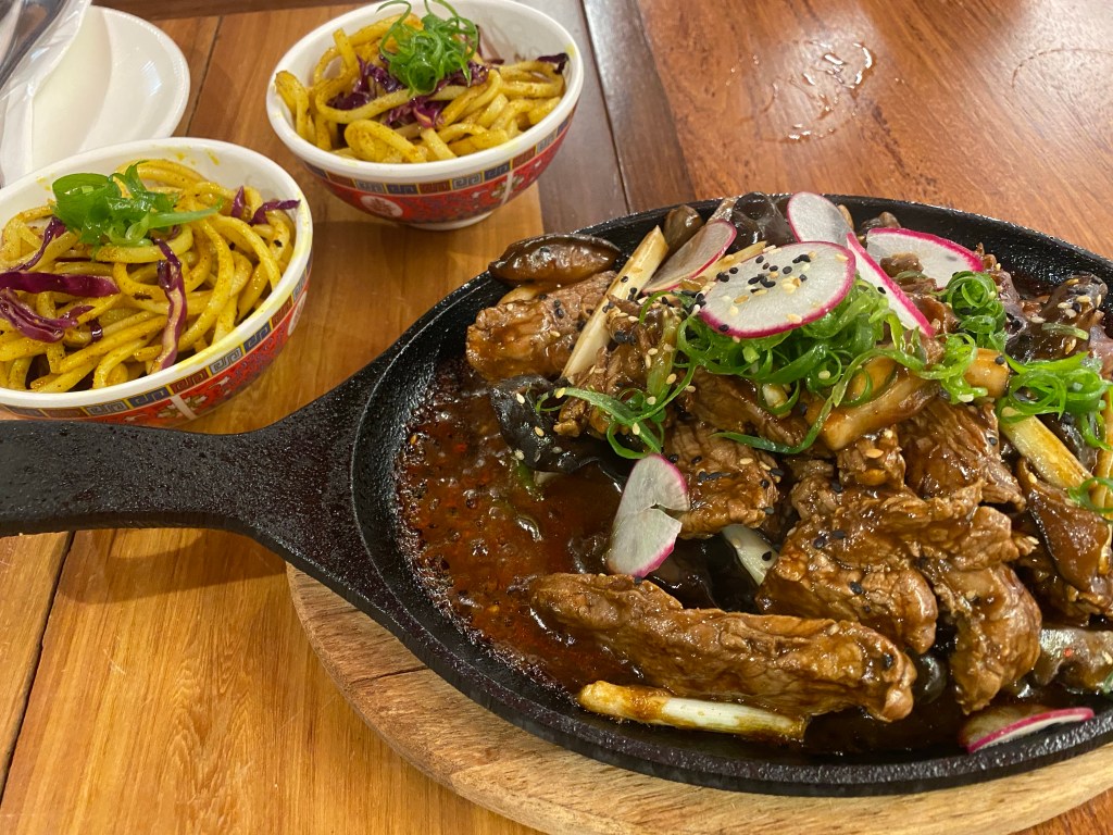 Como pratos principais, as Nossas Chapas, ideais para compartilhar: Camarões, legumes e amêndoas com arroz na wok com abacaxi (R$189); e Filé mignon ao wok, molho cantonês com mix de cogumelos e pak choi com macarrão ao curry (R$175).