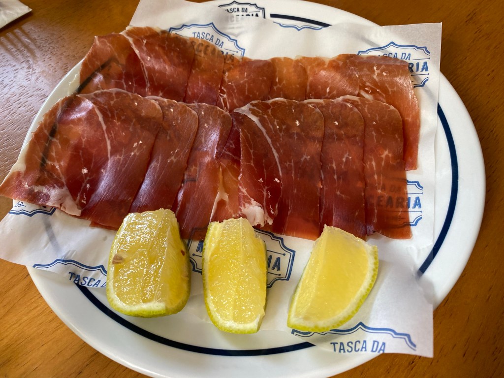 Outro saboroso aperitivo é o Presunto Pata Negra D.O.P, que vai muito bem com azeite e ervas, e é servido com torradas temperadas feitas na casa.