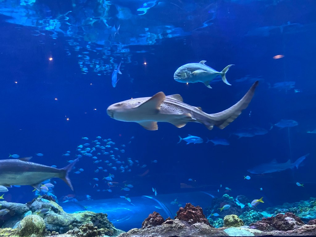-almoce no Shark’s underwater grill, um restaurante incrível junto a um dos grandes aquários do parque;