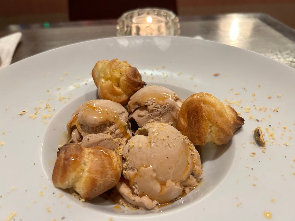 Para finalizar não deixe de experimentar o novo profiteroles Royale, servido com sorvete de avelã, calda de caramelo de laranja, e pistache caramelizado.