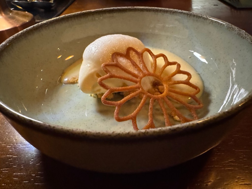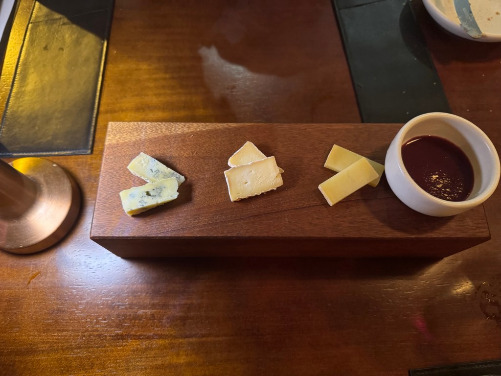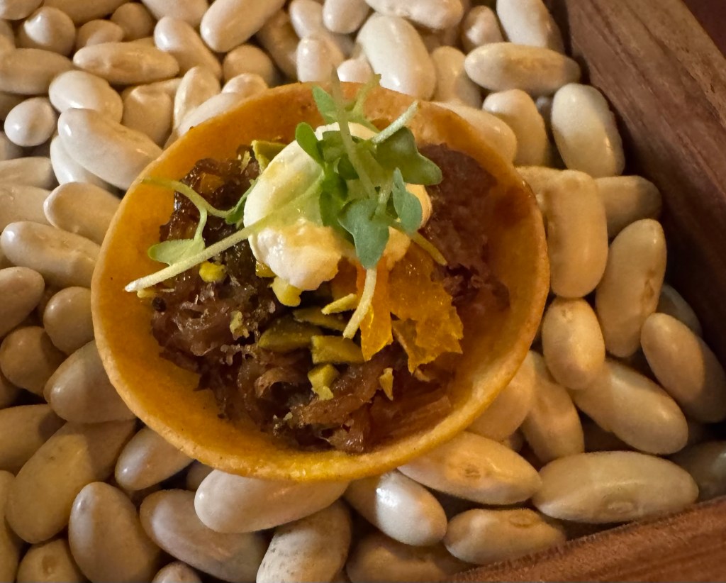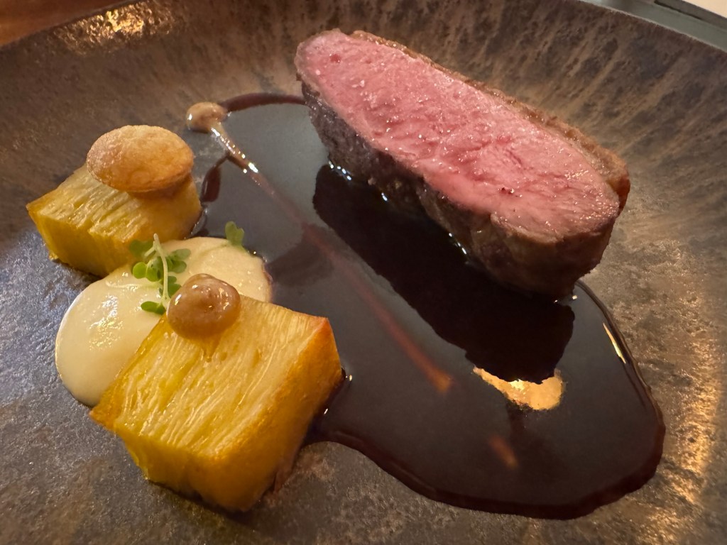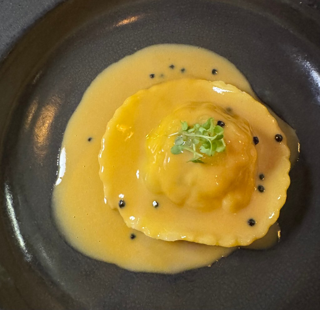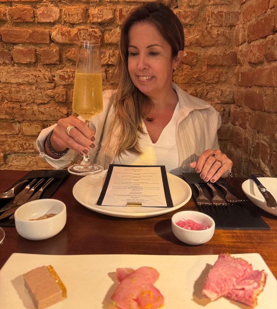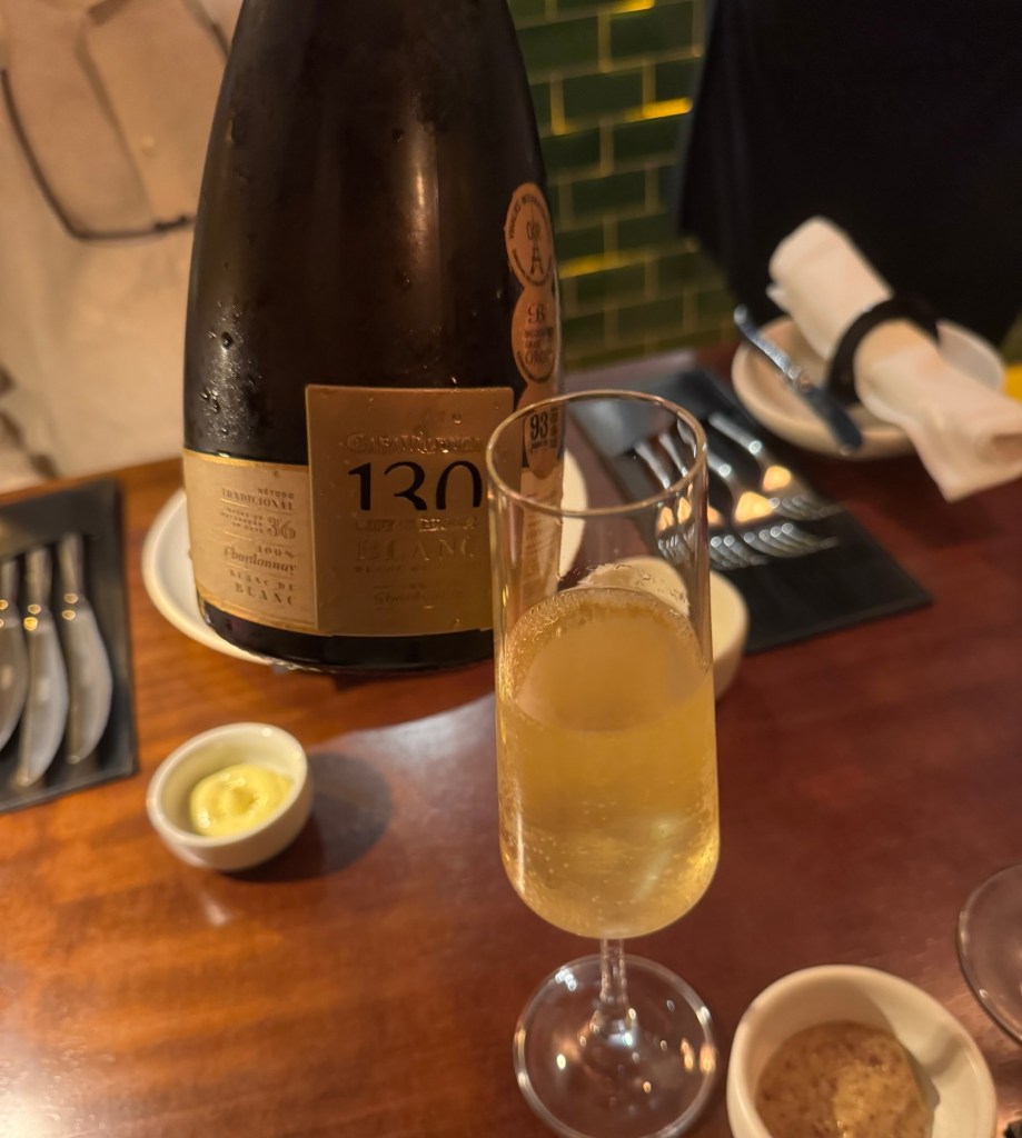 O menu que degustamos foi o de primavera ( servido até o final de janeiro/25) e teve início com espumante 130 – premiado da Casa Valduga – apresentado com pães quentinhos de fermentação natural servidos à mesa com manteiga maître d’hotel, mostarda da casa e azeite selecionado, além de três variedades da charcutaria e picles.