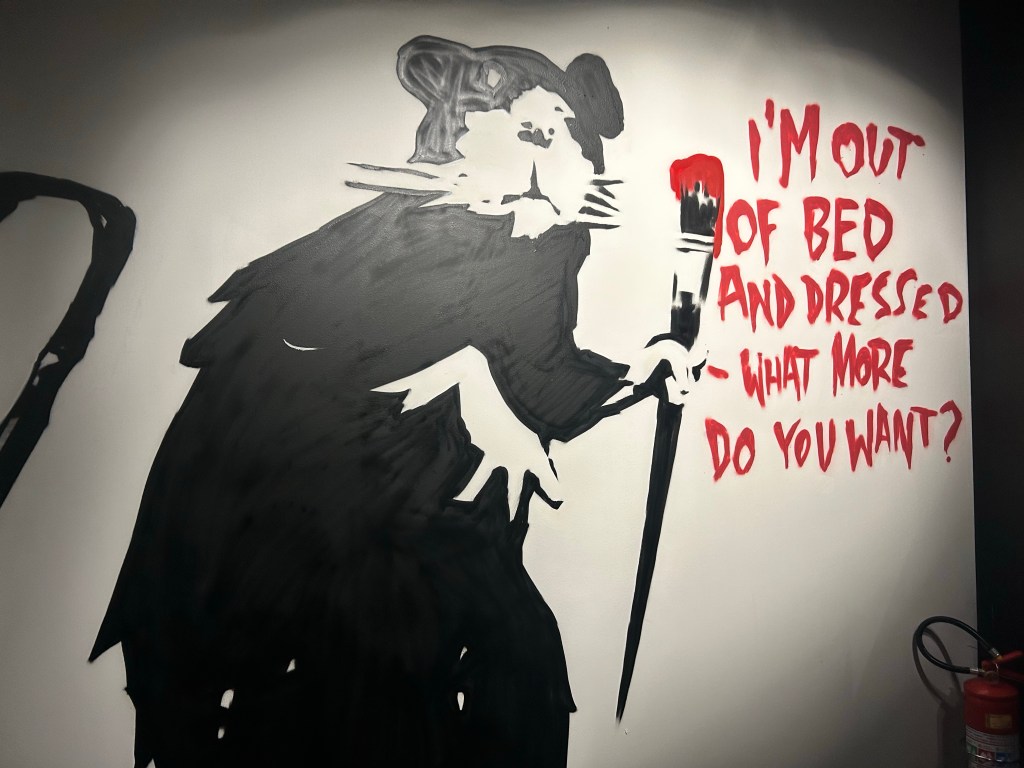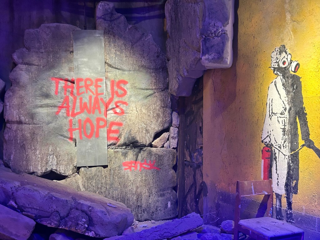 São exibidos também vídeos e um documentário sobre a vida e a obra do artista sem, no entanto, desvendar a identidade de Banksy – que permanece um mistério. Em uma sala de espelhos é possível uma imersão em imagens de obras de Bansky.
