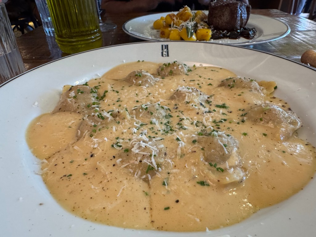 As entradas ganham preparações mais leves e contemporâneas, como a burrata servida com tomates confitados e o tartare de atum com stracciatella, finalizado à mesa – que atrai a atenção dos clientes. Nos pratos principais, o menu percorre diferentes regiões da Itália, com massas frescas recheadas, ragùs de cocção lenta e combinações que equilibram intensidade e elegância, como o ravioli de pato com foie gras ( foto)- destaque dentre as novidades do menu – e o pappardelle com ragu de javali.
