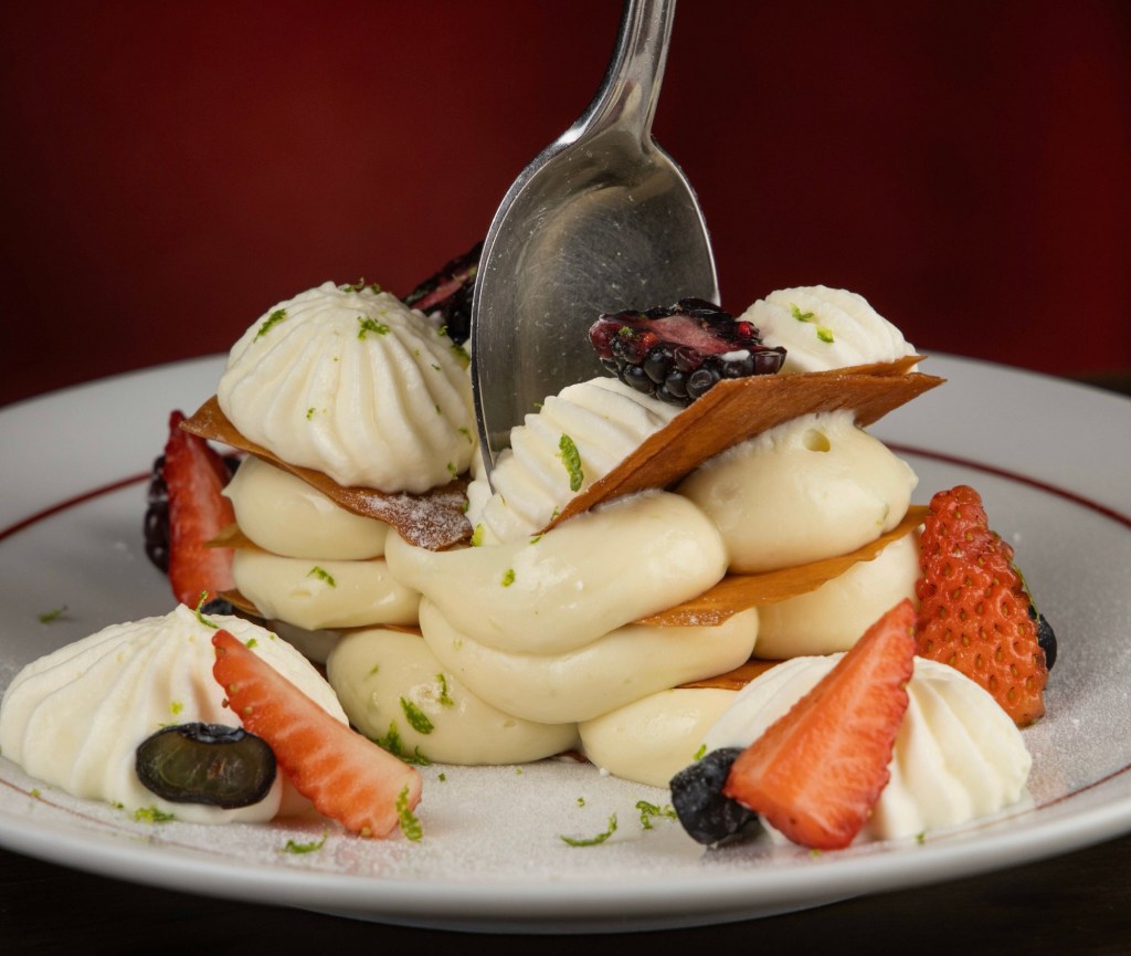 As sobremesas acompanham a renovação do cardápio com propostas que mantêm o espírito francês da casa. Entre as novidades estão o mil folhas de frutas vermelhas com ganache de limão e chantilly (R$ 42) e o brioche perdue servido morno, com caramelo de flor de sal, chantilly e raspas de laranja (R$ 46), encerrando a experiência com leveza e elegância.