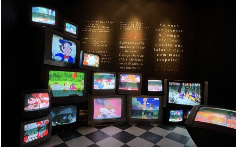Um dos ambientes mais instagramáveis da mostra é “Um Chá Maluco”, duas grandes instalações, uma com 20 TVs de tubo e outra com uma pilha de cadeiras, que contextualizam o encontro de Alice com o Chapeleiro Maluco e a Lebre.